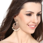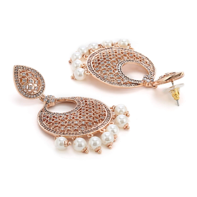 • Material: Alloy; Color: Rose Gold; Occasion: Western; Stone Type: Cubic Zirconia; Stone Color: White; Dimensions: 6.6 CM X 3.2 CM X 0.2 CM; Item Weight: 18.4 Gm; Pack contains: 1 Pair of Earrings