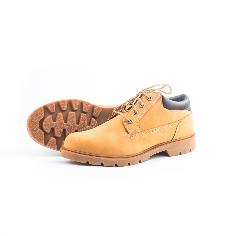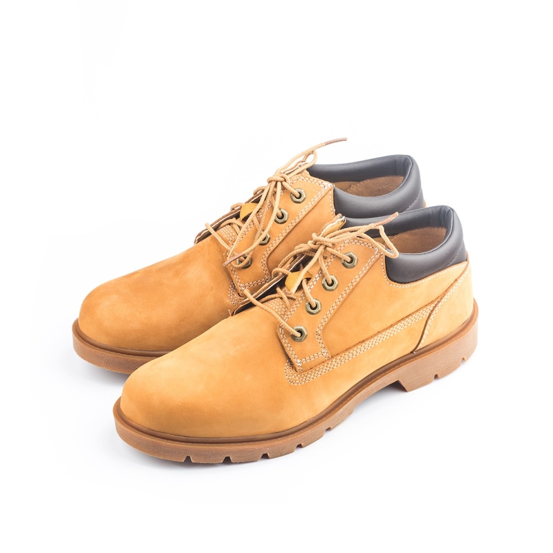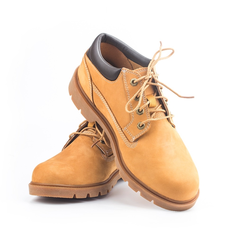 زوج من الأحذية الصفراء بمقدمة مستديرة، وتصميم منتظم، وتفاصيل أربطة