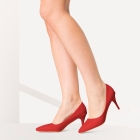 زوج من المضخات الحمراء، له كاحل منتظم وظهر مغلق