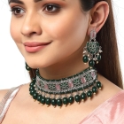 قلادة قلادة قلادة تقليدية مرصعة بالحجر باللون الأخضر والوردي مطلية بالفضة مع أقراط مجوهرات