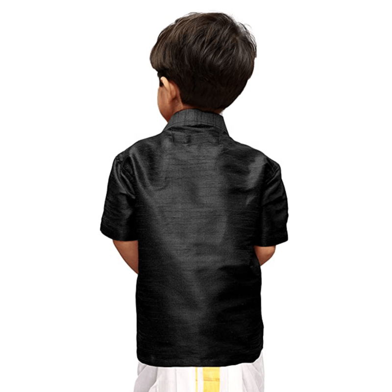 • Its spread collar accentuates its sophisticated charm, while the regular fit highlights its timeless appeal. This ethnic shirt, has a button placket, half sleeves, patch pocket and curved hem. These are perfect accompaniments for a silk dhoti for traditional occasions and also on trousers for a formal, classy look. In souther part of the subcontinent these shirts are widely adorned boys boys and men as a traditional wear for any auspicious occasion.