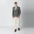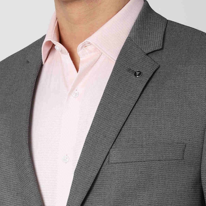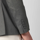 رمادي تصميم ذاتي نحيف يناسب سترة رسمية ، لديه طوق طية صدر محززة ، أكمام طويلة مع أزرار ، صدر واحد مع إغلاق زر ، 2 جيوب وهمية مع لوحات ، 1 جيب على الصدر و 2 جيوب داخلية ، بطانة متصلة ، حافة خلفية مزدوجة التهوية.