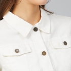 سترة بيضاء صلبة، بياقة عريضة، 2 جيب، زر للإغلاق، أكمام طويلة، حافة مستقيمة، وقطن