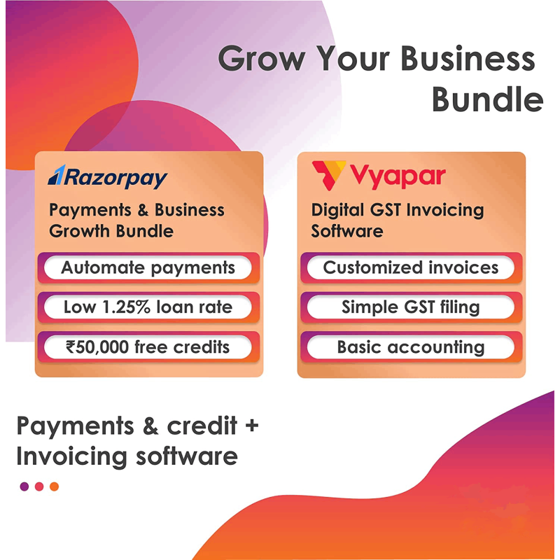 • The Grow Your Business bundle includes 2 software packages to manage your Payments & Credit (Razorpay) and Billing, Accounting and Inventory (Vyapar Mobile Premium)